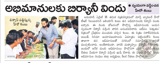 అడయార్, ఏప్రిల్ 18. తమిళ చిత్రపరిశ్రమలో మోస్ట్ బ్యాచిలర్ హీరో టీఆర్ సిల/ ఇచ్చారు. ఈ విందు భోజనంలో పాల్గొన్న అభిమానులకు ఆయన స్వయంగా బిర్యానీ వడ్డించి వారిని ఆనందపరిచారు. ఇటీవల 'పత్తుతల' చిత్రంలో ప్రేక్షకుల ముందుకు వచ్చిన శింబు... ఈ చిత్రం నిరాశేపరిచింది. అయితే, సినిమా జయాపజయాలను ఏమాత్రం పట్టించుకోని శింబు తాజాగా తన అభిమానులతో నగరంలో సమావేశమై వారితో ముచ్చటించారు. అంతేకాకుండా, వారికి మధ్యాహ్నం బిర్యానీ వడ్డించారు. ఇందులో అనేక మంది అభిమానులు పాల్గొనగా ప్రతి ఒక్కరికీ శింబు చేతలు మీదుగా బిర్యానీ వడ్డించి ఖుషీ చేశారు. ఈ విందు పార్టీలో శింబు అభిమానుల సంఘం జిల్లా అధ్యక్షులు, కీలక నేతలు పాల్గొన్నారు. బిర్యానీ వడ్డిస్తున్న హీరో శింబు.
